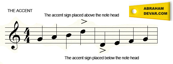 The accent symbol is placed over the note head or below it. The accent symbol means that the performer will play the note louder and ensure that it is more pronounced than the other notes without the accent symbol.