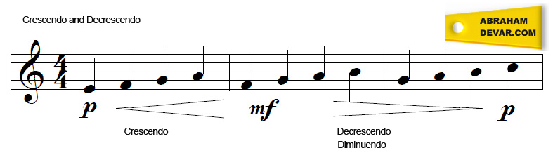 Crescendo: gradually getting louderDecrescendo: gradually getting softerDiminuendo: gradually getting softer