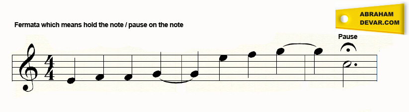 The fermata sign may be written above or below a note head. It instructs the performer to pause on the note within the context of the piece of music. The note will be longer in duration than its neighbouring notes in the bar of music. In the figure below, the performer is required to pause on the last note of the bar. The last note of the bar is a dotted minim or dotted half note and has a value of three beats. The, pause, sign implies that the note will be held longer than three beats.