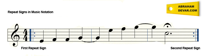 How to use the repeat signs in music notation. The second repeat sign in the example tells the performer to repeat the piece of music from the first repeat sign. If the first repeat sign is not present, repeat from the beginning of the piece. This will often be followed ‘first ending’ and ‘second ending’ of a part.