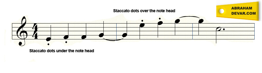Staccato dots may be placed above or below the note head. The affected notes are played disconnectedly.