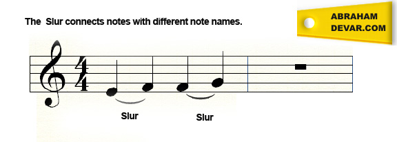 How the Slur is written in music notation. The slur connects the sounds or pitches of two different notes and requests that the performer plays them smoothly or connectedly.