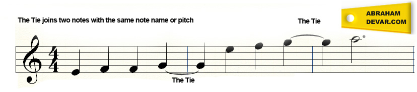 The Tie joins two notes with the same pitch. The example below demonstrates the use of the tie in a piece of music.