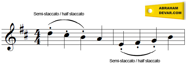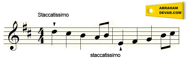 In extreme staccato the note is somewhat shortened in duration because of the detachment. The wedge symbol is used above or inverted below the note head as indicated in the illustration below.