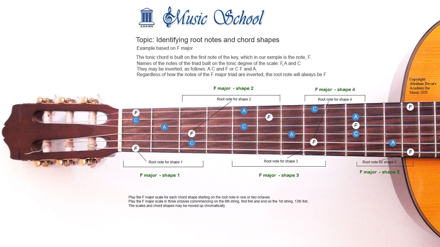 Knowing where the root or tonic note is located makes it easier to find the chord shape and also play the major, minor, pentatonic or other scales. The F major triad is: F, A and C. The triad may also be inverted as follows: A, C, F and C, F, A.