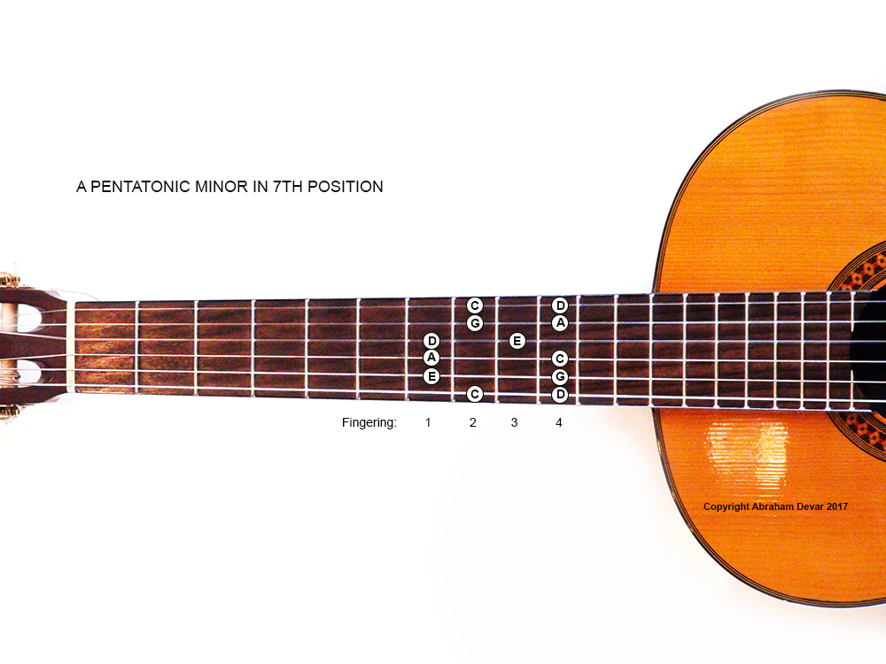 The A minor pentatonic scale shape in the seventh position spanning 2 octaves. Includes finger indications.