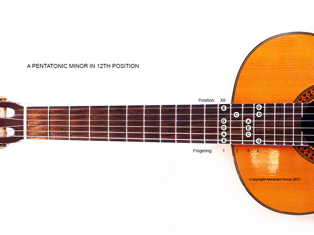 The A minor pentatonic scale shape in the 12th position - two octaves, with appropriate fingering.