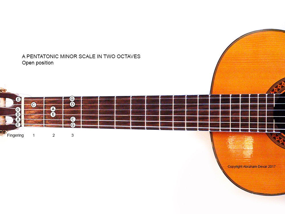 The A Minor Pentatonic shape in open position with appropriate fingering - Two octaves