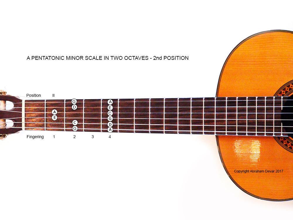 The A Minor pentatonic scale shape in second position with finger indications - two octaves