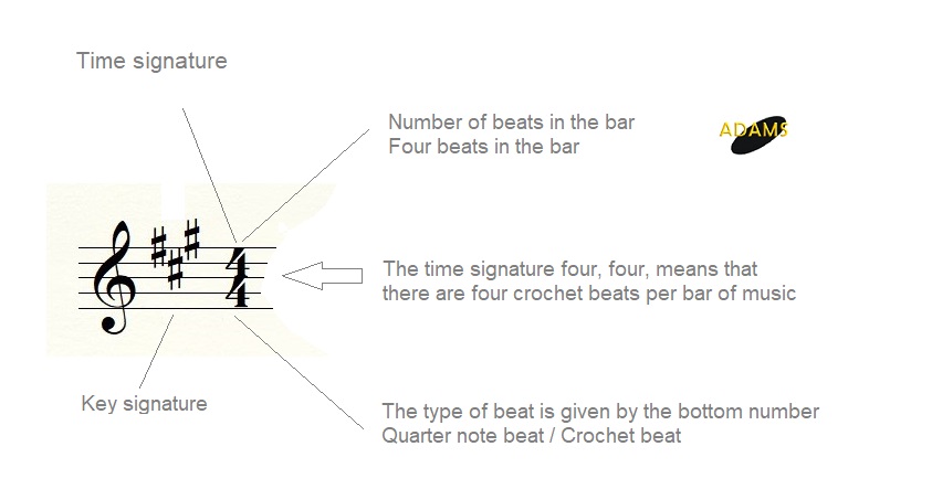 The time signature looks like a fraction with a numerator and denominator. Lets take a look at the example below, which is pronounced four, four time. The top number refers to the beats and the bottom number refers to the type of beat that will be prevalent in the piece of music. Notice that the key signature appears first and is followed by the time signature, in our illustration.
