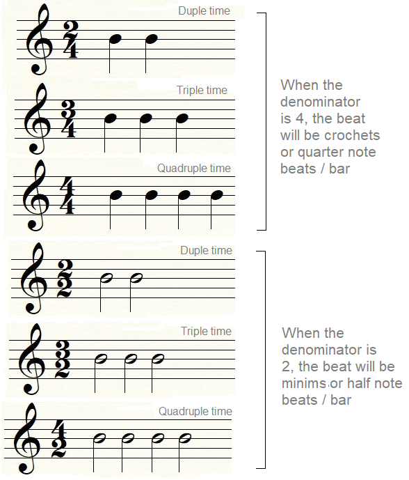 The numerator tells the performer how many beats are allocated to the bar for a regular rhythm. The denominator decides whether a beat is an eighth note / quaver, quarter note / crochet, or half note / minim.