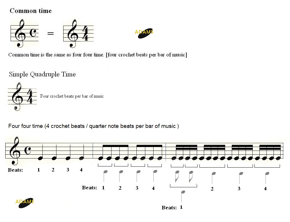 The type of beat may be a minim, crochet, quaver, semiquaver, demisemiquaver. We learned about note types in an earlier discussion and will use them here. The American names of the note types are, the half note, quarter note, eighth note, sixteenth and thirty second note among others.