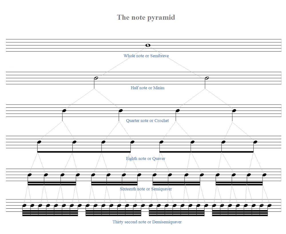 whole note = 1half note / minim = 1/2quarter note / crochet = 1/4eighth note / quaver = 1/8sixteenth note / semiquaver = 1/16