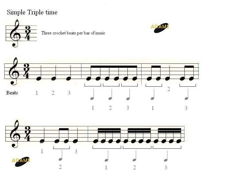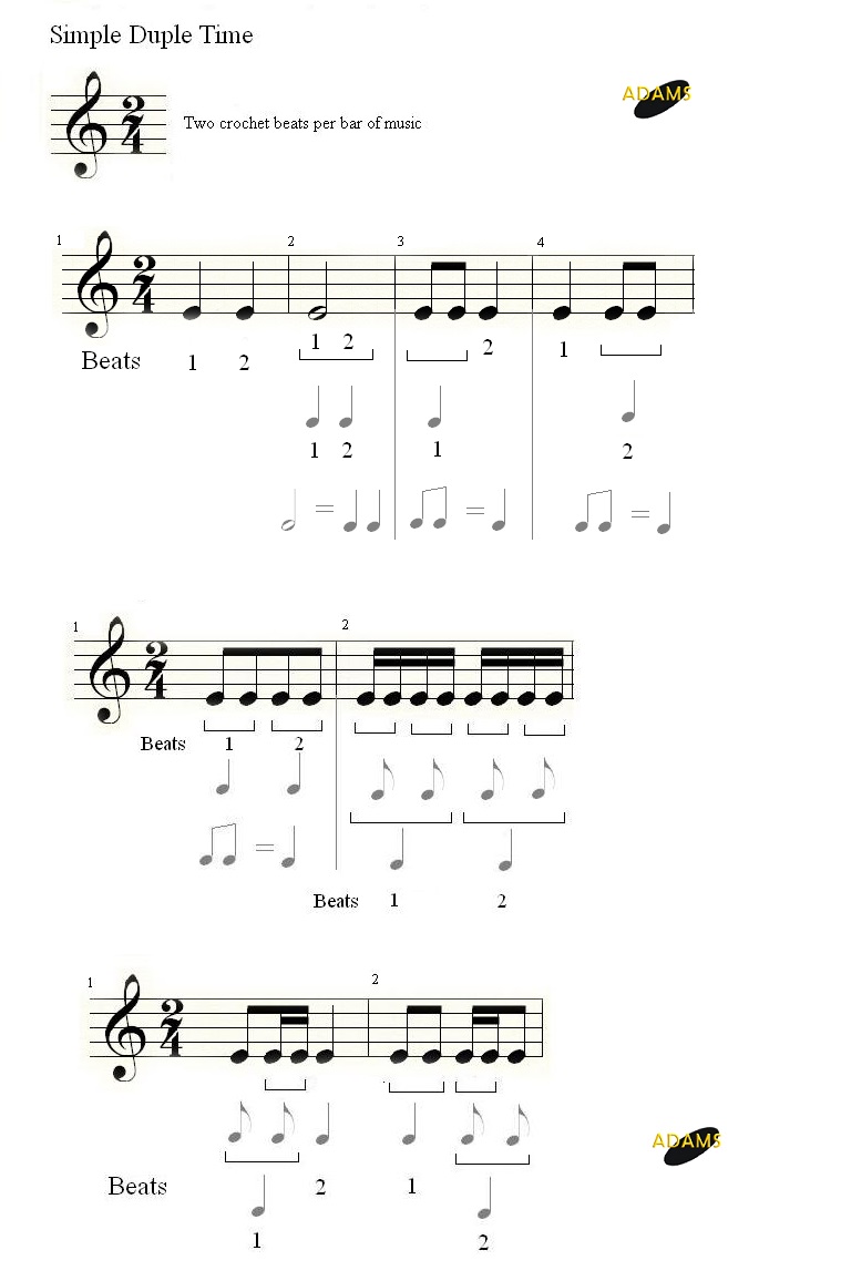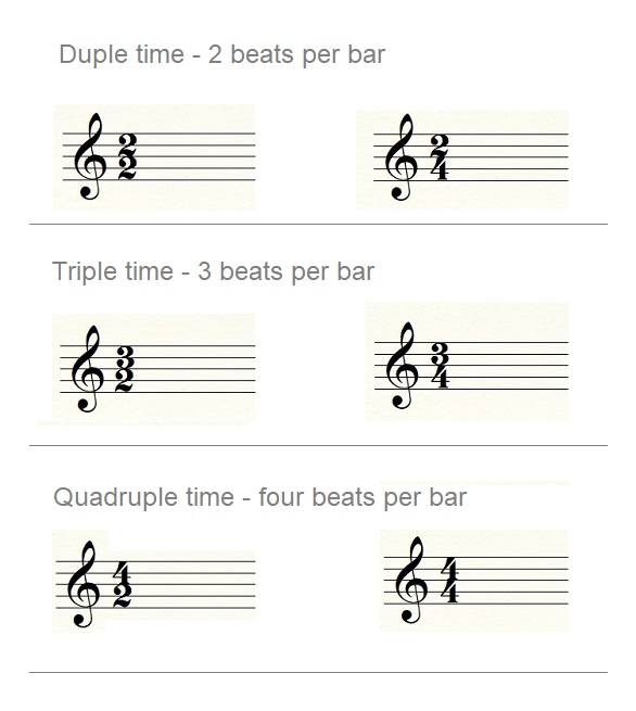 Simple time signatures are divided into three subcategories, duple time, triple time and quadruple time with two, three and four beats respectively.